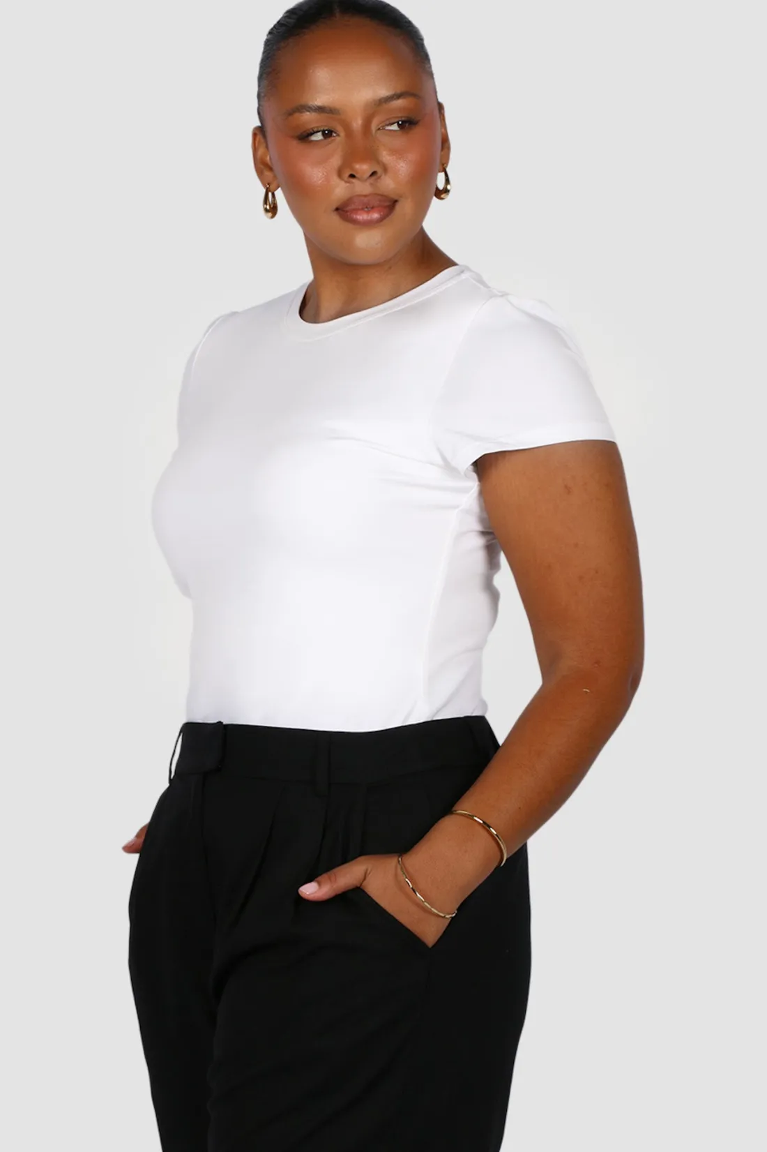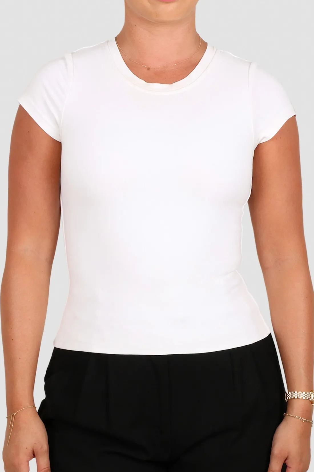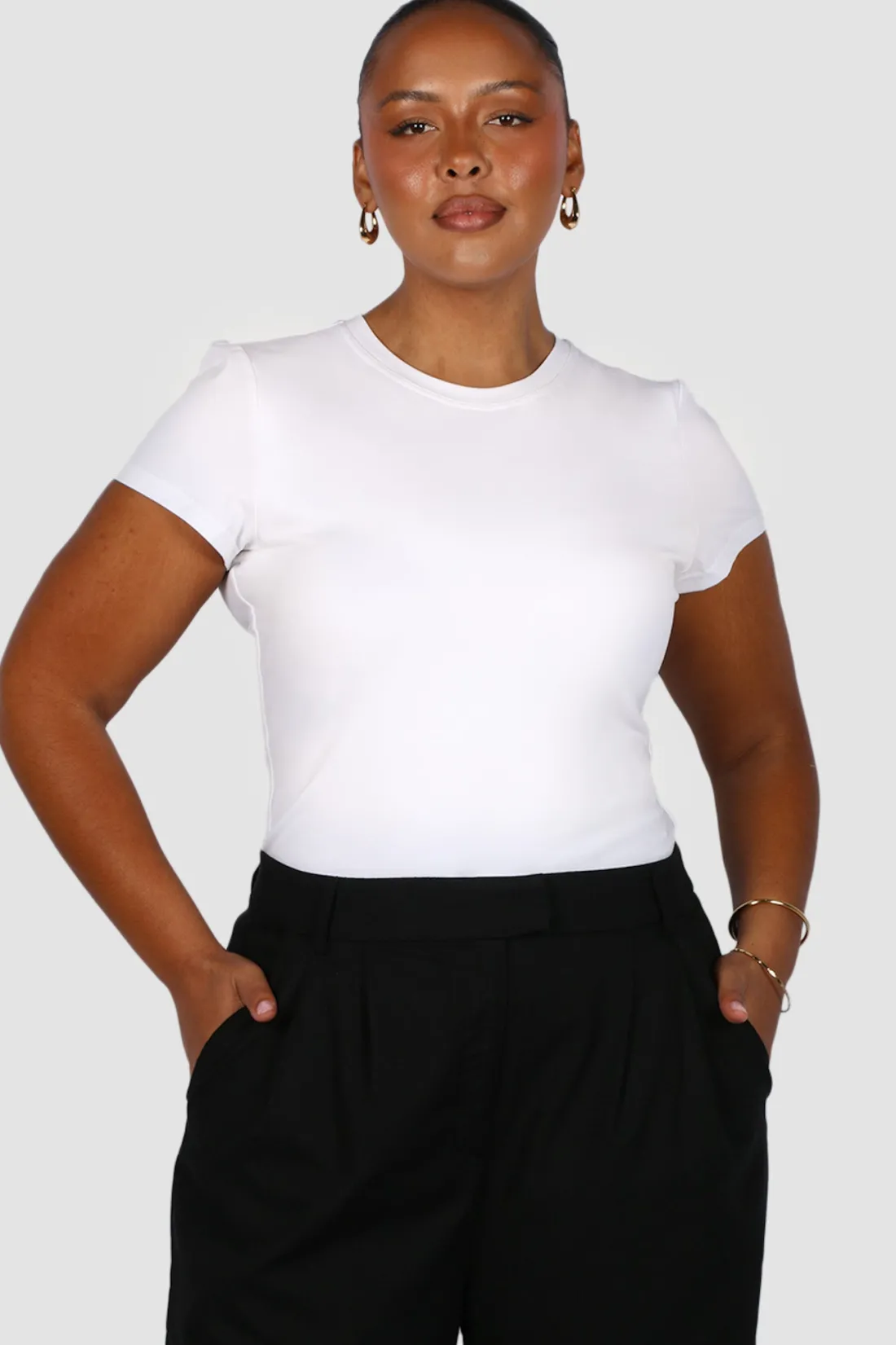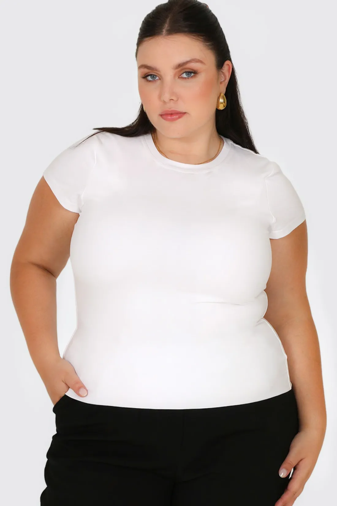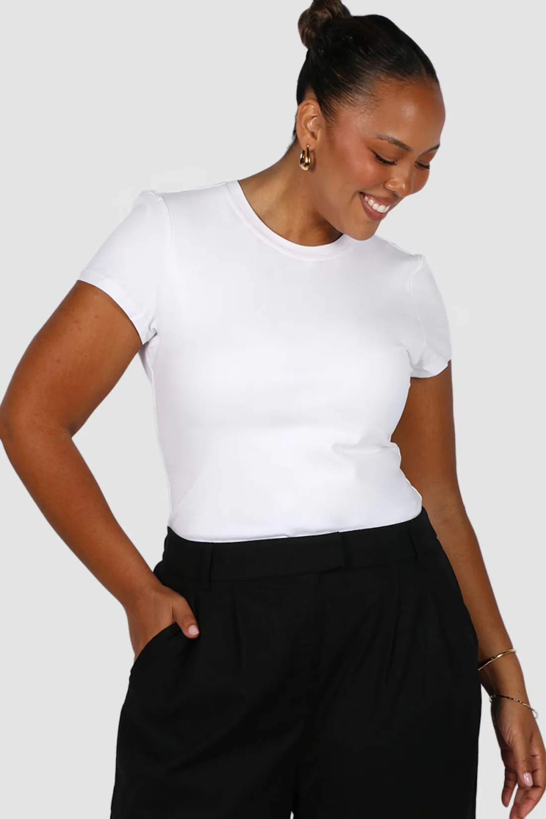 The ultimate buttery, basic, pair with everything tee of your dreams! Tuck our buttery tee into your fave pair of Fayt jeans, wear her untucked with tights and sneakers or fold her up for a crop vibe with a mini skirt and heels! Made from our signature, stretchy dreamy fabric you know and love, this piece will hold you in like a piece of shape wear and be that tee you reach for time and time again!